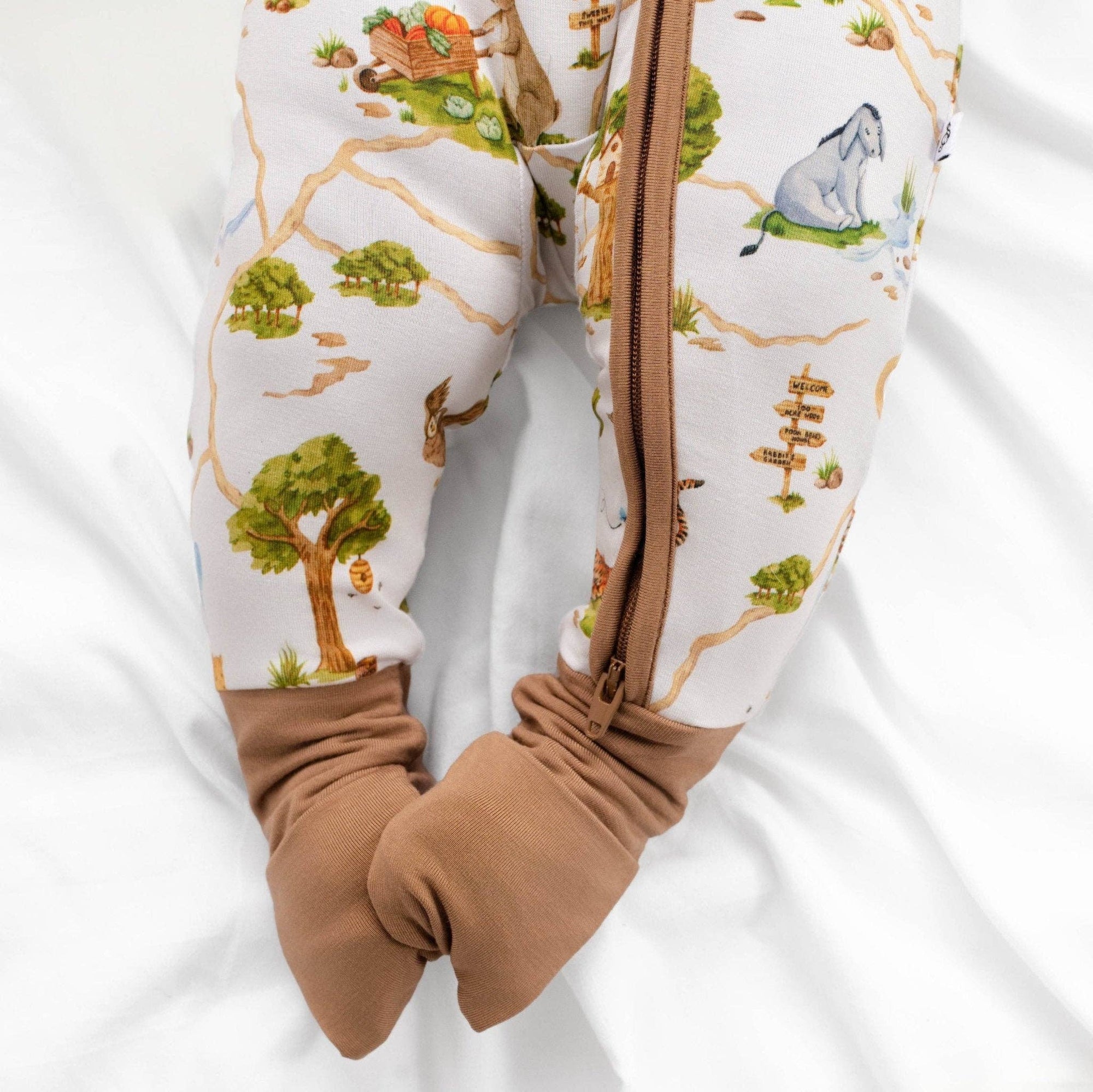 The Jammie Session Winnie The Pooh Sleeper brings together everyday comfort and timeless charm. Made from a luxuriously soft blend of 95% bamboo and 5% spandex, this romper is breathable, stretchy, and oh so gentle on sensitive skin, perfect for cozy naps, playful mornings, and everything in between. Thoughtful details make this romper a favorite: a double zipper allows for quick and easy diaper changes (from top or bottom!), while protective zipper guards keep baby’s skin safe. Fold over mittens on all sizes help keep tiny hands warm and prevent scratches, and convertible feet allow you to switch between footed and footless in seconds. Starting at 6 months, grippy soles add traction for little ones on the move.