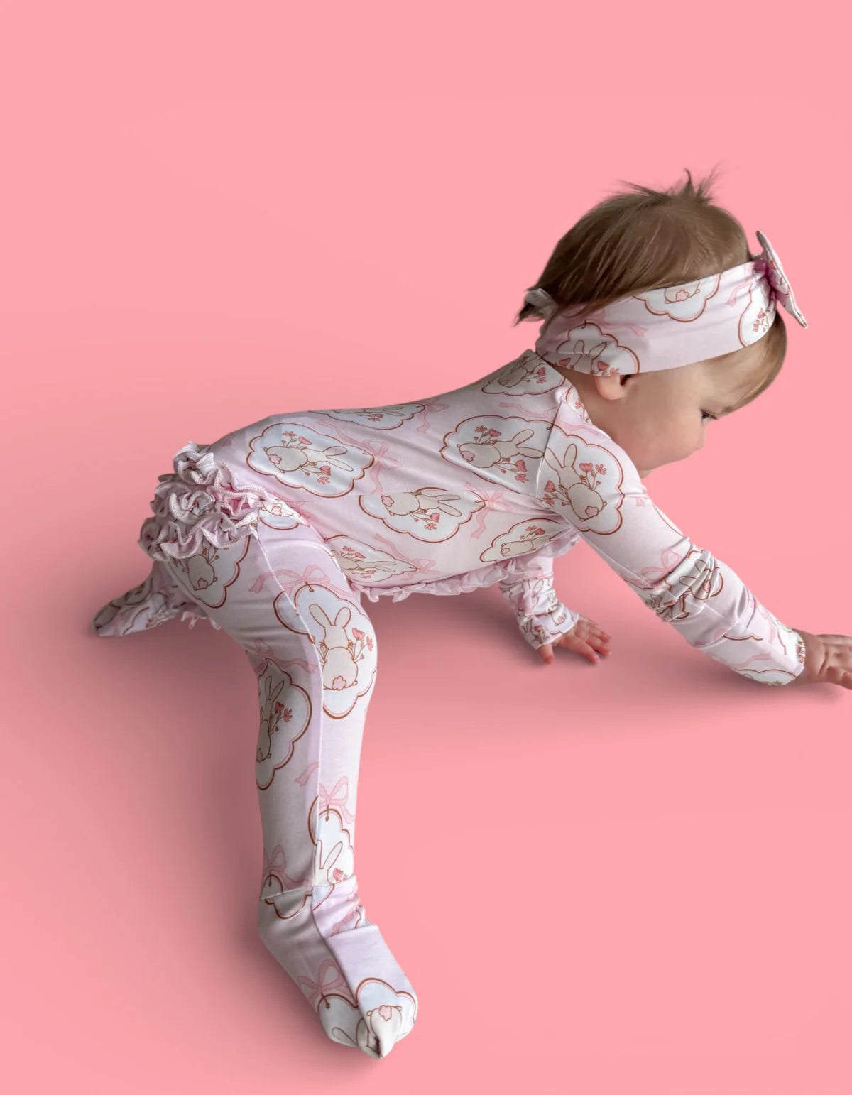 Bunny Bow Blossoms Dream Ruffle Romper 🐰🌸 Pretty, playful, and picture-perfect. Our Bunny Bow Blossoms Dream Ruffle Romper features a darling blush bunny + bow print with soft florals — made for Easter baskets, spring celebrations, and all the sweet snuggle moments in between. ✨💗