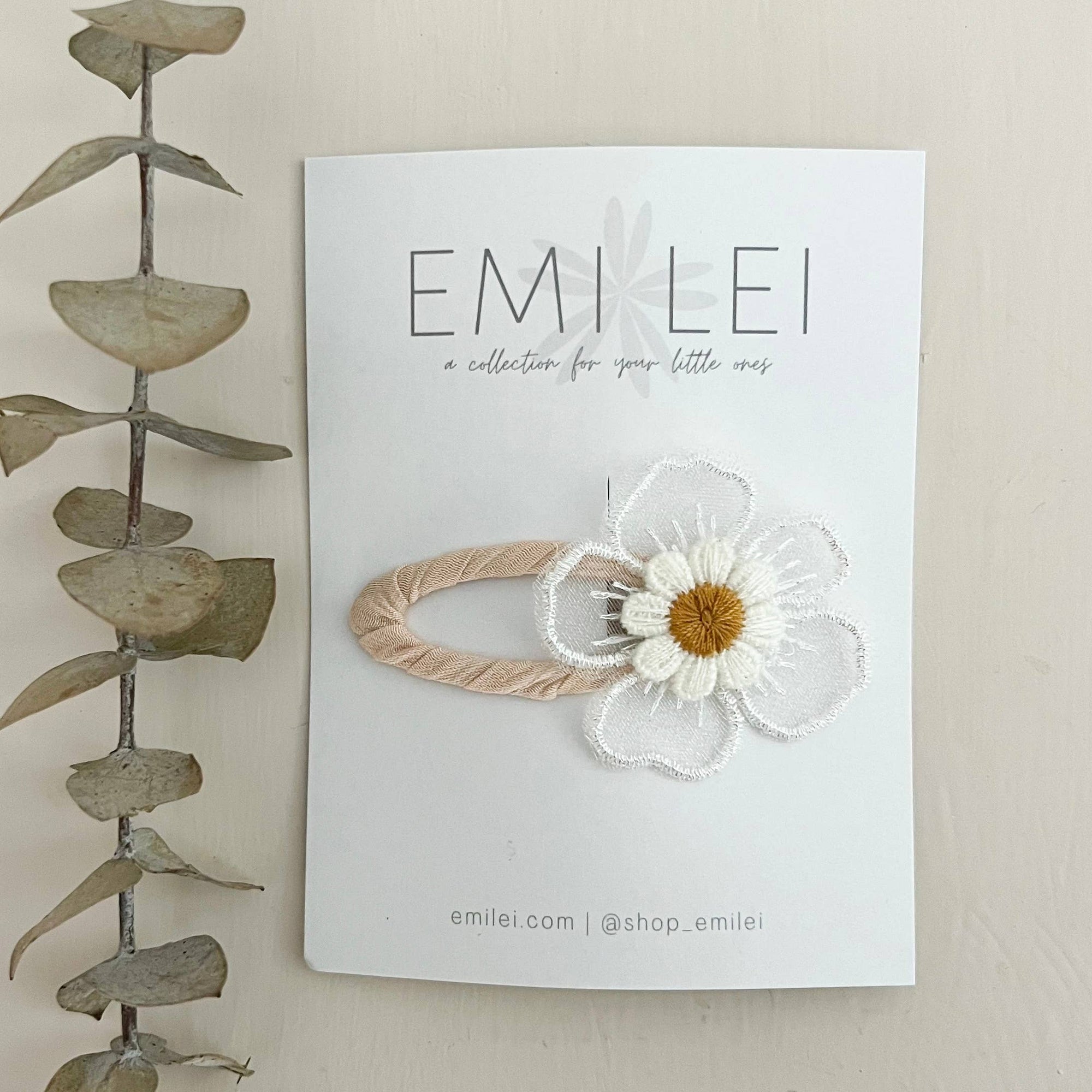 Daisy + 1 Clip + Metal clip secured so fabric wont slip off + Size: Approx 2.5" x 1.5" + Every clip is unique - placement will not be exactly as shown in photo.