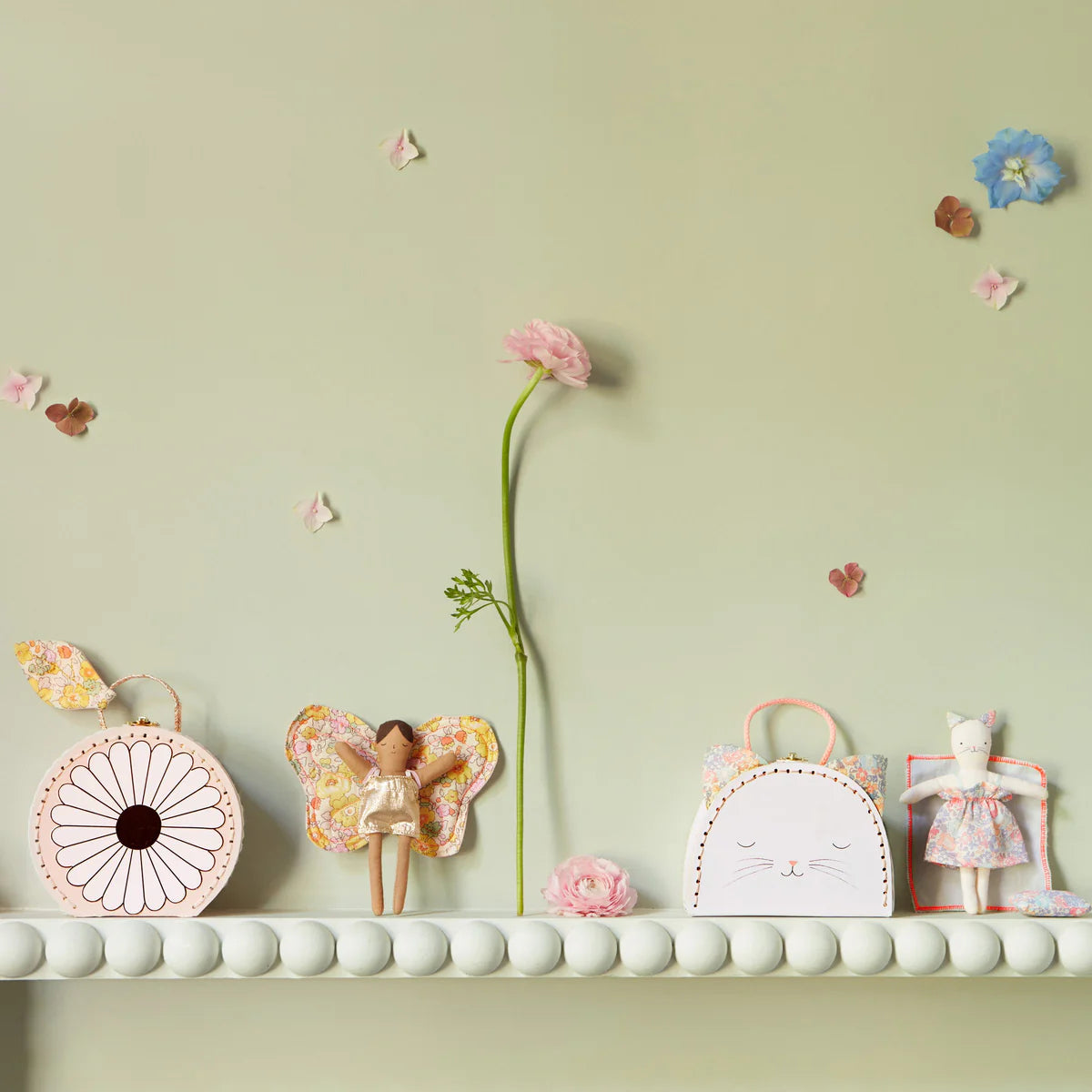 Little people who love mini suitcases and adore cats will be absolutely delighted with this sensational set! It's perfect to play with at home or take on adventures. Featuring a mini suitcase crafted from stitched, laminated card with sweet cat features and Liberty fabric ears. Inside is a beautiful little kitty doll, crafted from cotton with a Liberty fabric dress and a quilt and pillow to snuggle up with.