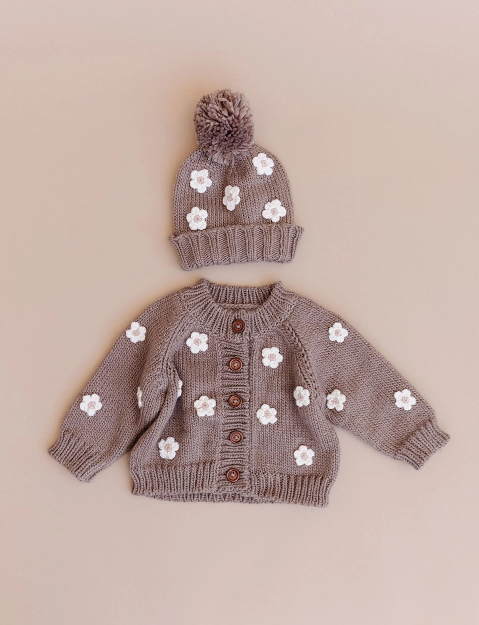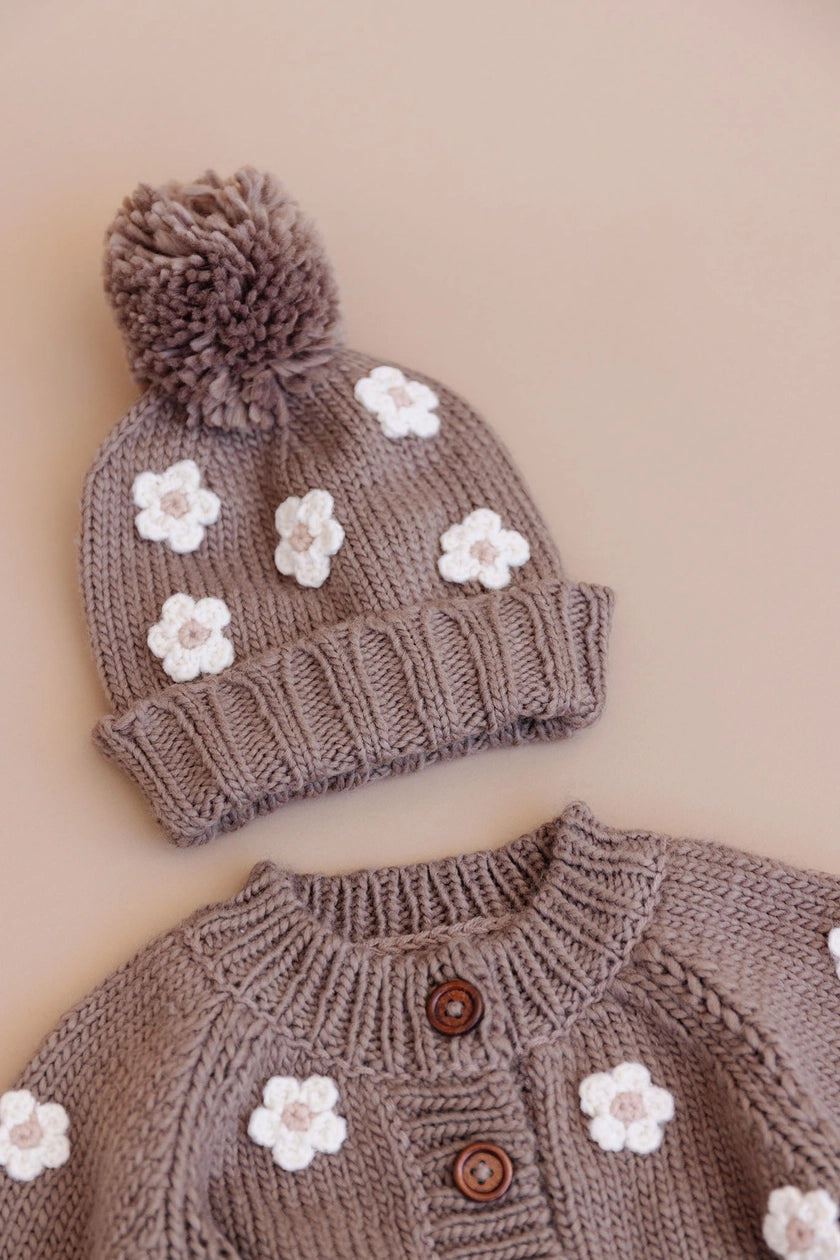 Stroll through a field of flowers with our Flower Baby & Kids Beanie - Tan. Featuring Cream and Blush hand-crocheted flowers, pair with our matching Flower Cardigan.