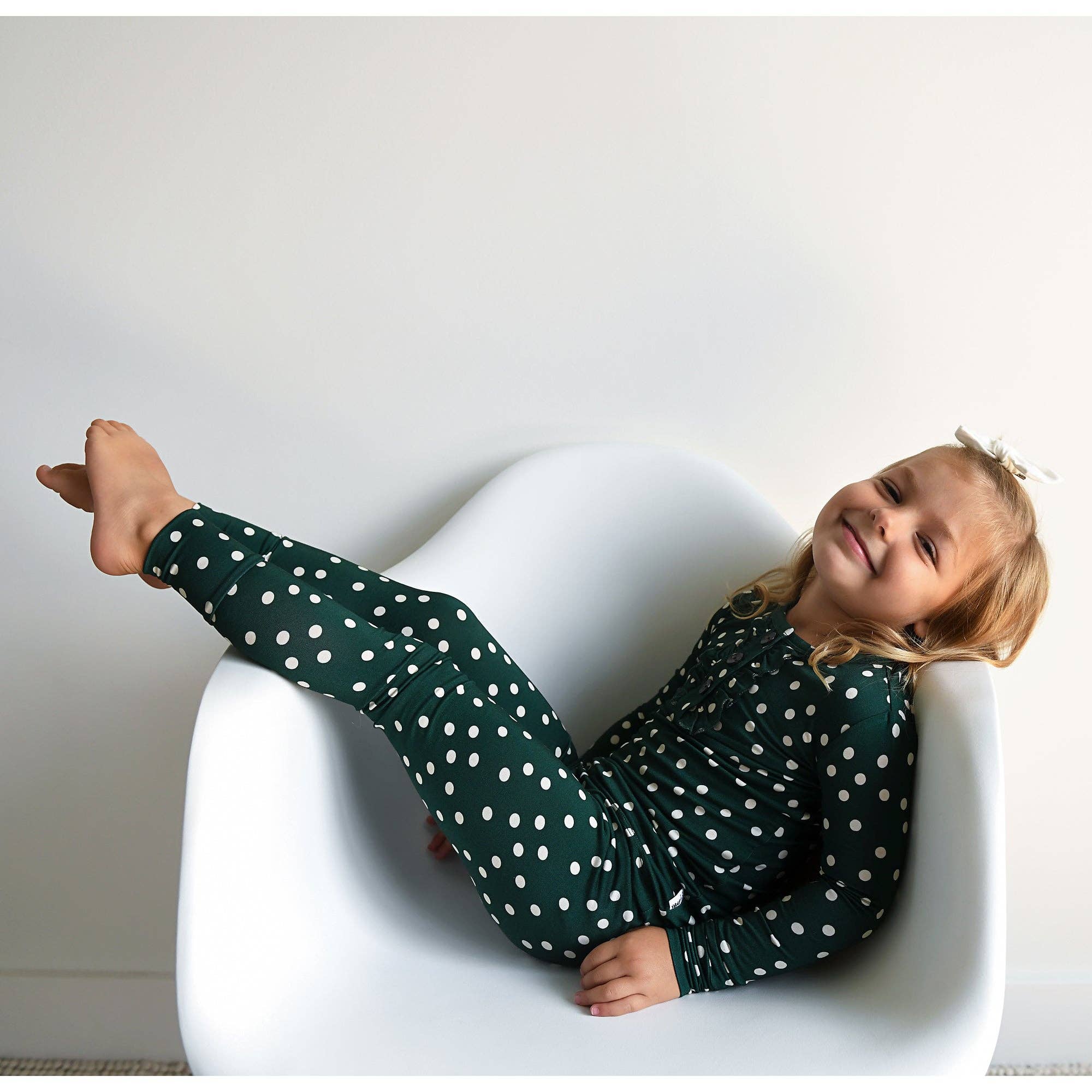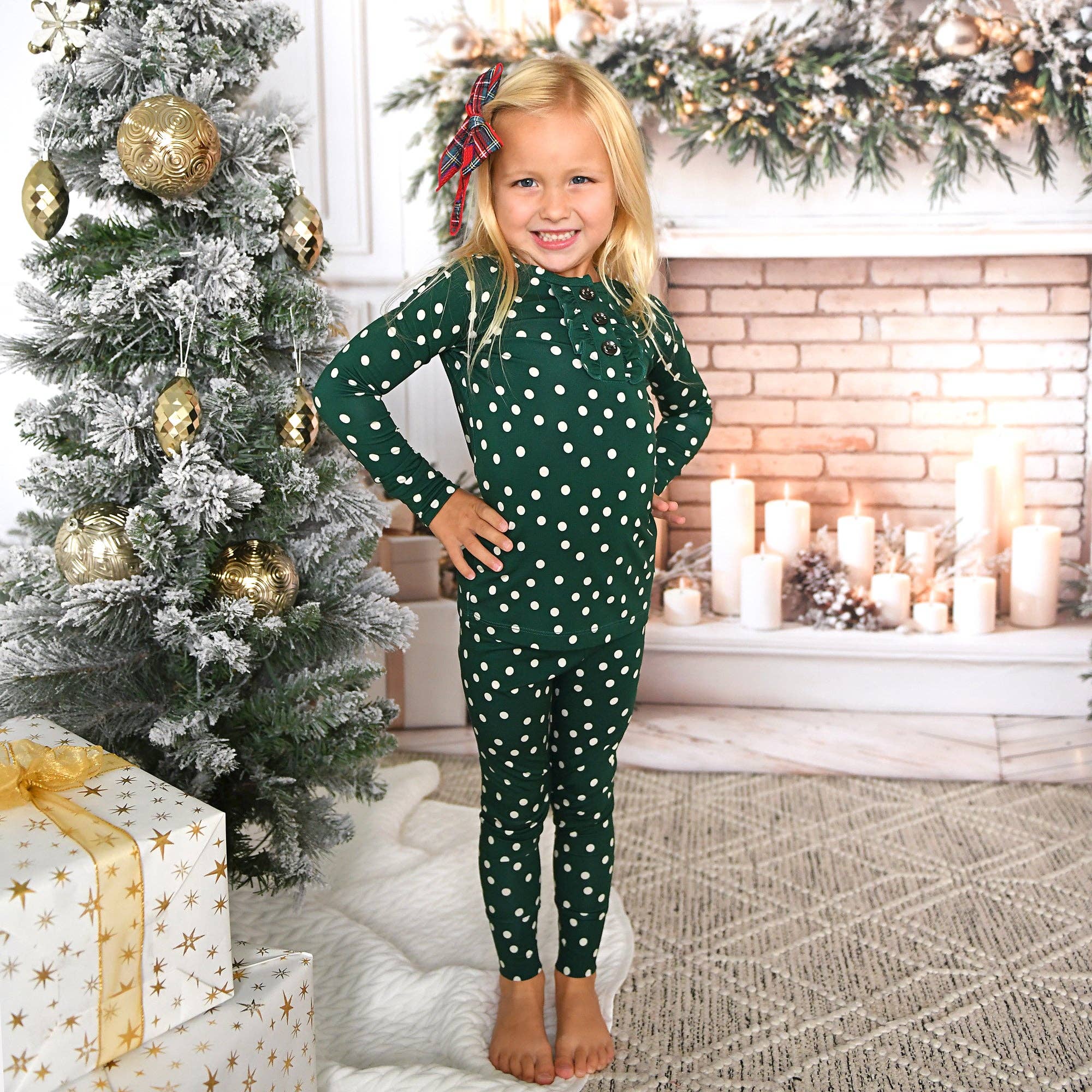 Wrap your little one in the luxurious softness of our Bamboo Toddler 2-Piece Pajama Sets in our Dottie Ruffle Christmas print (a white and green polka dot print). Crafted from premium bamboo fabric, these sets are designed to provide unmatched comfort and breathability, perfect for all-day play and peaceful naps.