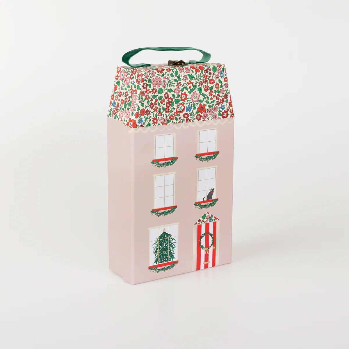 This enchanting suitcase-style paper house features a joyful Liberty floral print roof, luxurious green velvet ribbon handle, burnished brass closure, and clever festive illustrations, perfect to display on a table or mantel for a stunning effect. Open to reveal numbered doors, with Liberty floral prints.