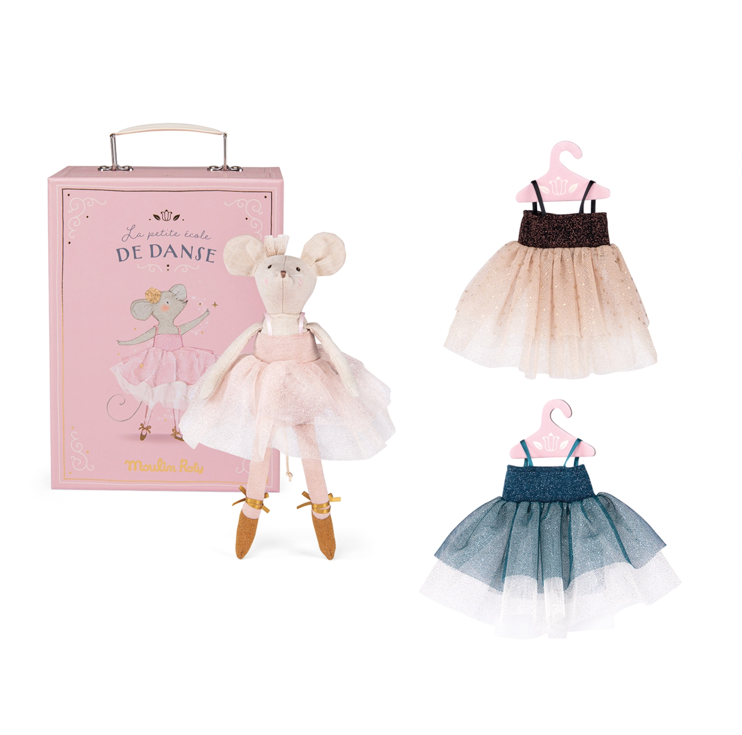 Little Mouse from the Little school of dance, beckons us for a peek inside her wardrobe.A small case with an acrylic unbreakable mirror, containing three tutu dresses (star, pearl and luxury) on hangers. Pirouettes amidst a shower of glitter and sparkle! Magic awaits on the dance floor!