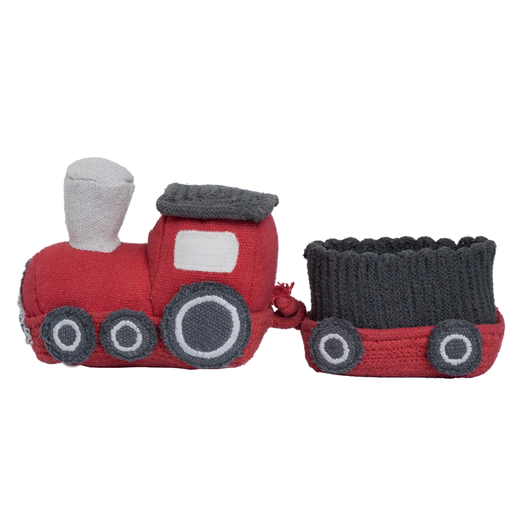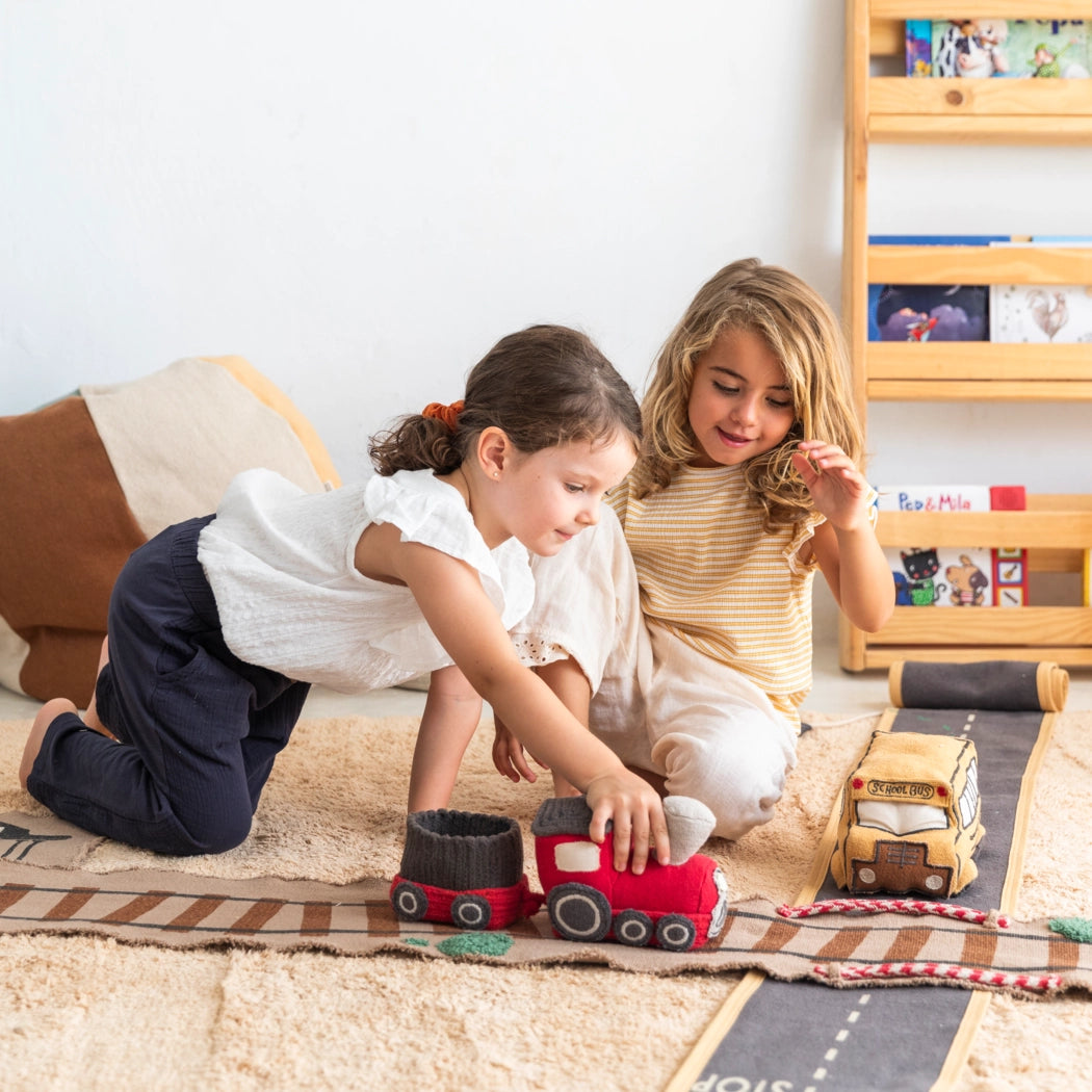 Choo choo, all aboard the train! Next stop: Barcelona. The Ride & Roll Train is a handcrafted textile toy that consists of a soft toy train made in red that comes rolled up in a 4 meter long canvas road with printed train tracks, level crossing barriers in red and white, and a train station. Having braided strings at the edges, it can easily be rolled and tied up together with the train cushion, converting into a practical briefcase for on-the-go adventures!"